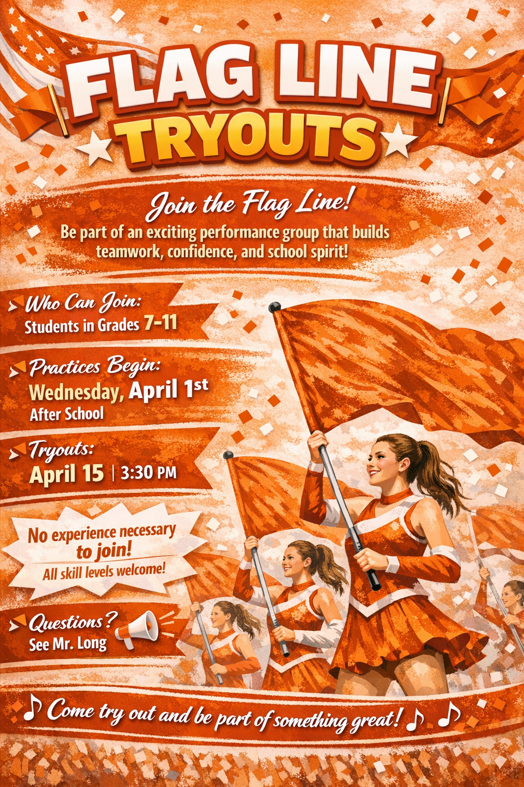 Interested in joining Flag Line? If you’re interested, meet in the band room after school this Wednesday! Don’t miss your chance to be part of an exciting group and show your school spirit!